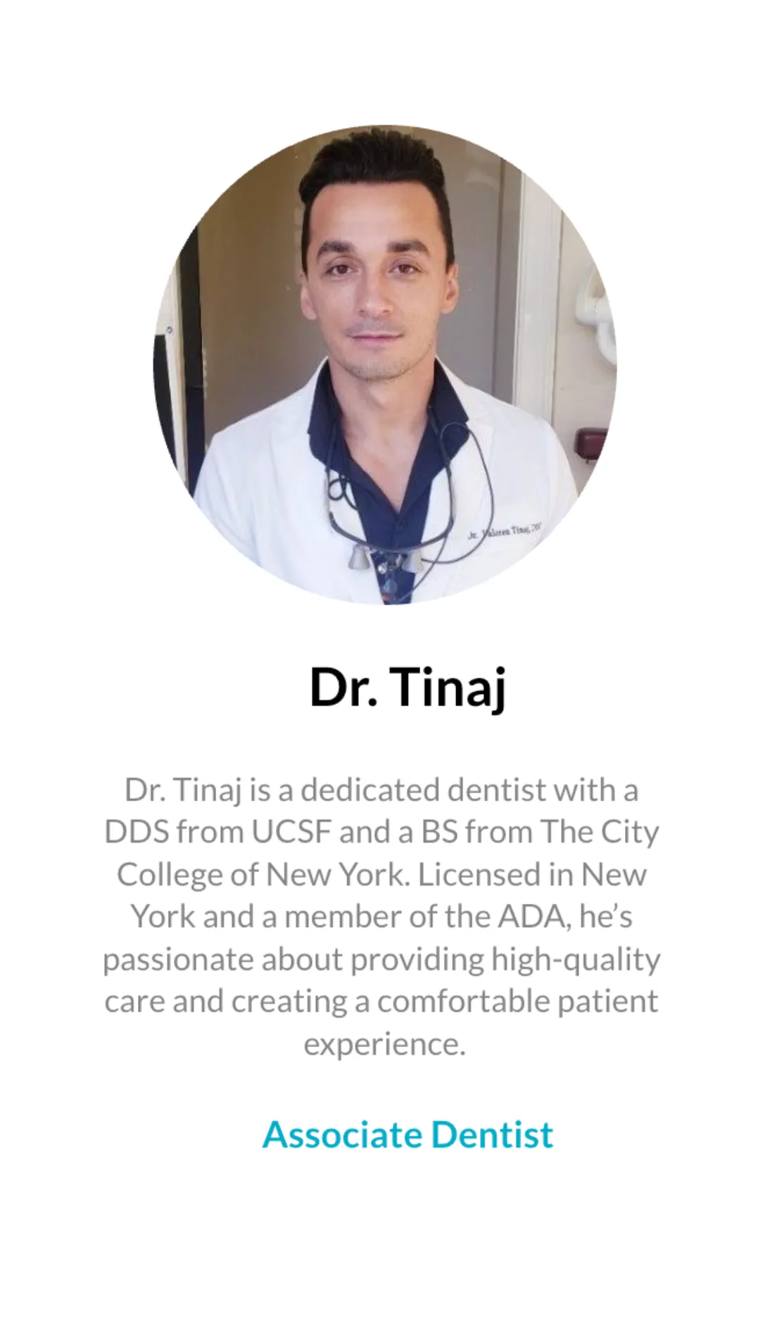 Dr. Tinaj is a dedicated dentist with a DDS from UCSF and a BS from The City College of New York. Licensed in New York and a member of the ADA, he’s passionate about providing high-quality care and creating a comfortable patient experience.
