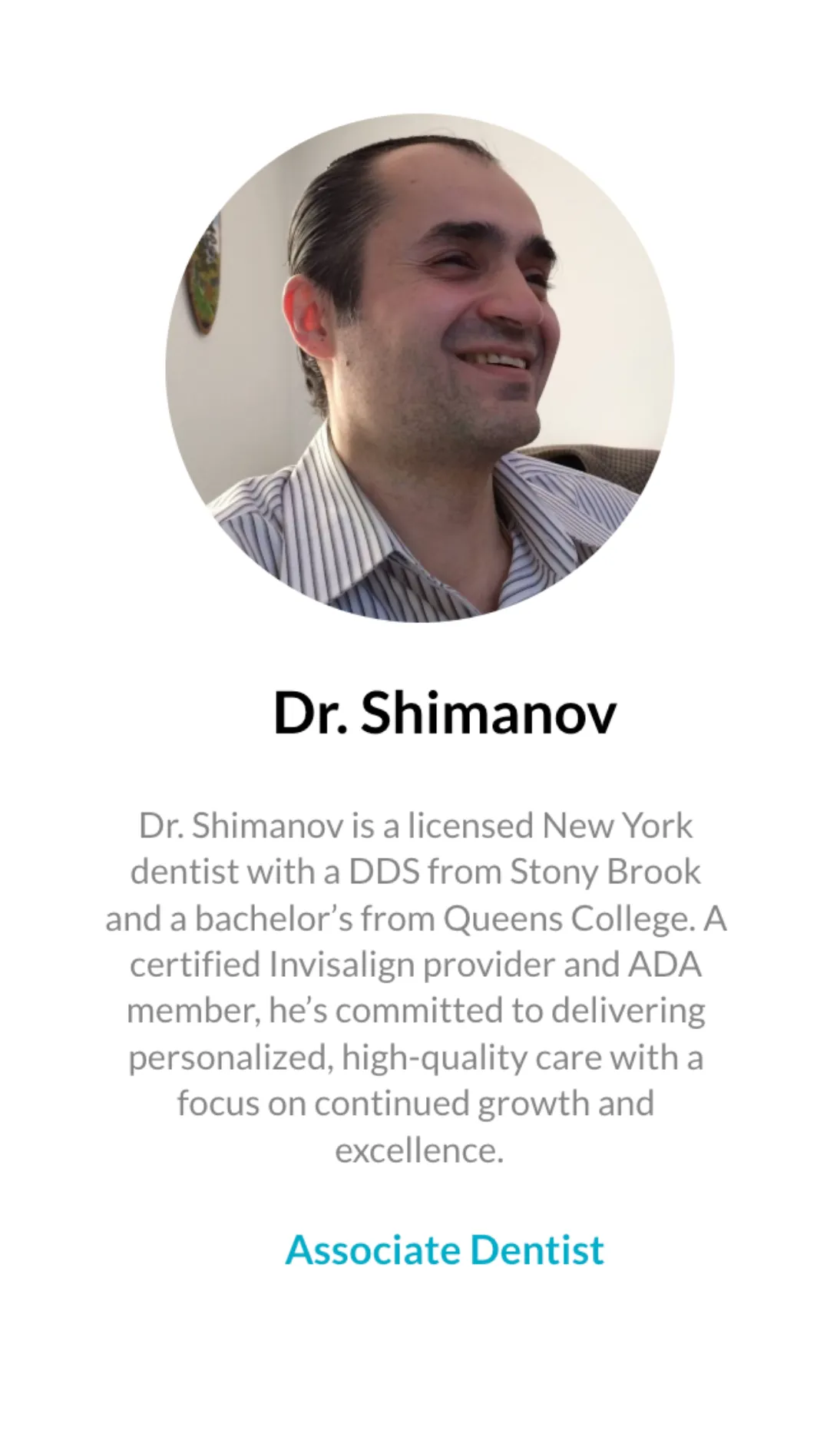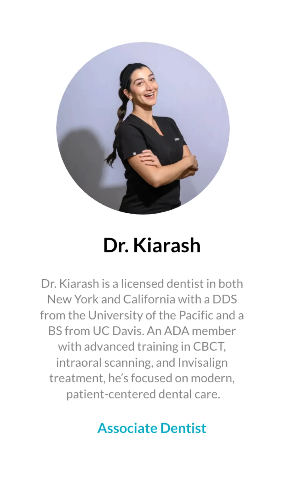 Dr. Kiarash is a licensed dentist in both New York and California with a DDS from the University of the Pacific and a BS from UC Davis. An ADA member with advanced training in CBCT, intraoral scanning, and Invisalign treatment, he’s focused on modern, patient-centered dental care.