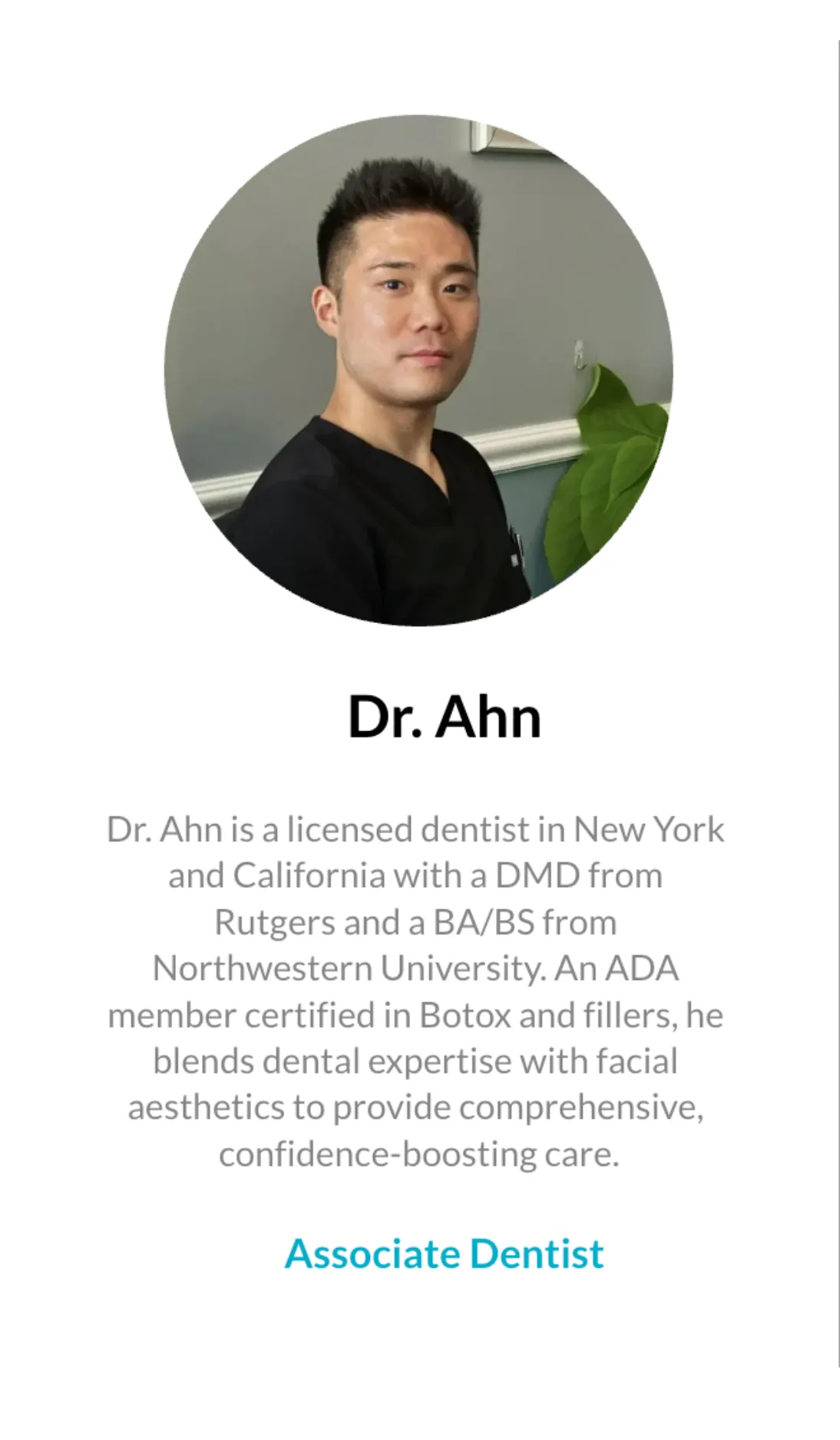 Dr. Ahn is a licensed dentist in New York and California with a DMD from Rutgers and a BA/BS from Northwestern University. An ADA member certified in Botox and fillers, he blends dental expertise with facial aesthetics to provide comprehensive, confidence-boosting care.